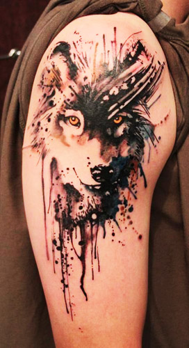 Otra de las grandes tendencias son el tipo de tatuaje de acuarela, donde encontrarás diseños de tattoos de lobos muy buenos que te recomiendo.
