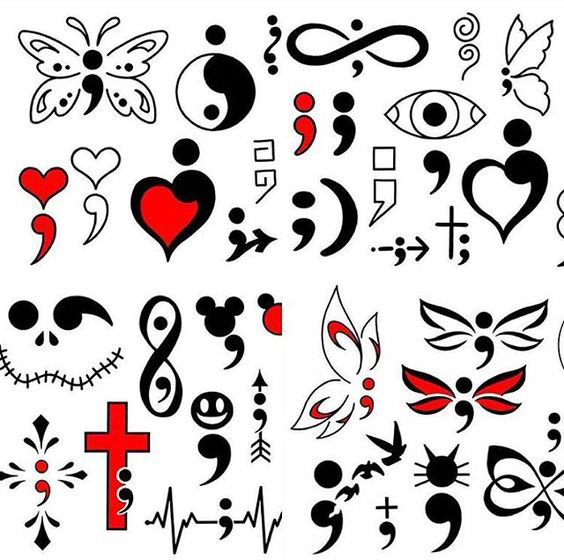 El tatuaje relacionado con el signo de puntuación: punto y coma, surgió en el 2013, como un símbolo distintivo del proyecto de igual nombre que representa la lucha por mantener la salud mental, así como la importancia de la prevención del suicidio. Este movimiento está dedicado a representar la esperanza y el amor para aquellas personas que están luchando contra la depresión, el suicidio, la adicción y la autolesión. El Tatuaje de Punto y Coma es más que un tatuaje de frases, es un historia.